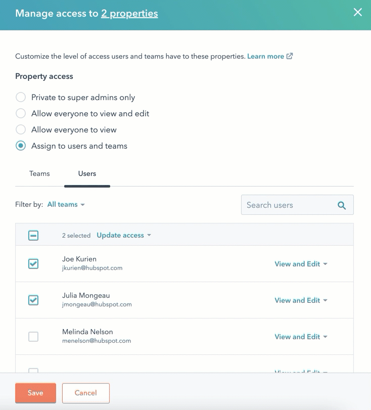 Możesz wybrać, kto ma dostęp podczas tworzenia właściwości lub zaktualizować dostęp do istniejących właściwości. Ograniczenia widoku i edycji można ustawić tylko dla właściwości kontaktu, firmy, transakcji, biletu i obiektu niestandardowego.