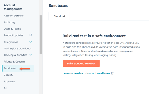 Os Superadministradores podem criar contas de sandbox padrão para testar as funcionalidades sem impactar a conta principal da HubSpot. Por exemplo, você pode conectar um aplicativo à sua conta de sandbox padrão para testar uma nova integração. Em seguida, você pode sincronizar os dados da sua conta principal para testar a integração, mas ainda assim manter os dados da conta principal organizados.