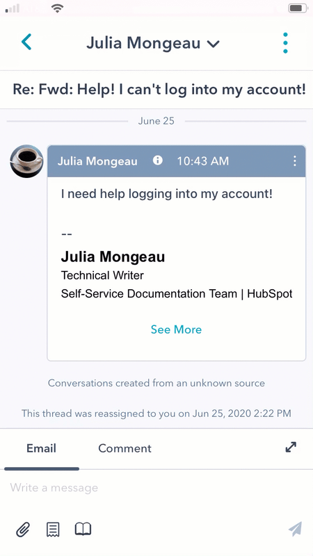 您可以在 iOS 和 Android 版HubSpot 行動應用程式上存取對話收件匣。您可以回應開放的對話,為其他團隊成員新增註解,或將對話重新指派給其他團隊成員。