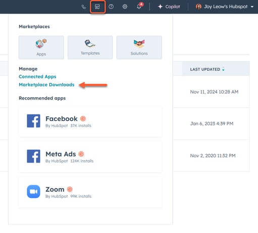 - 在您的 HubSpot 帳戶中,點擊頂部導覽列中的marketplace Marketplace 圖示。然後,選擇市場下載。
