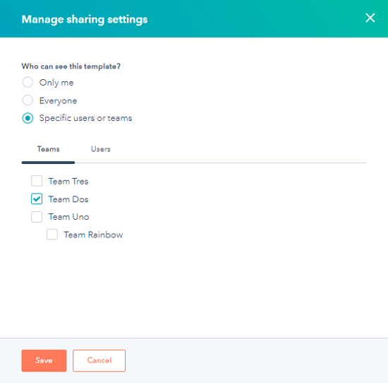 - 特定用戶和團隊:只有特定用戶和團隊可以查看和使用銷售內容。 若要授予存取權限,請選取團隊或使用者旁邊的核取方塊。 此選項只能由超級管理員或擁有指定Sales Hub或Service Hub Professional和Enterprise座位的使用者選擇。